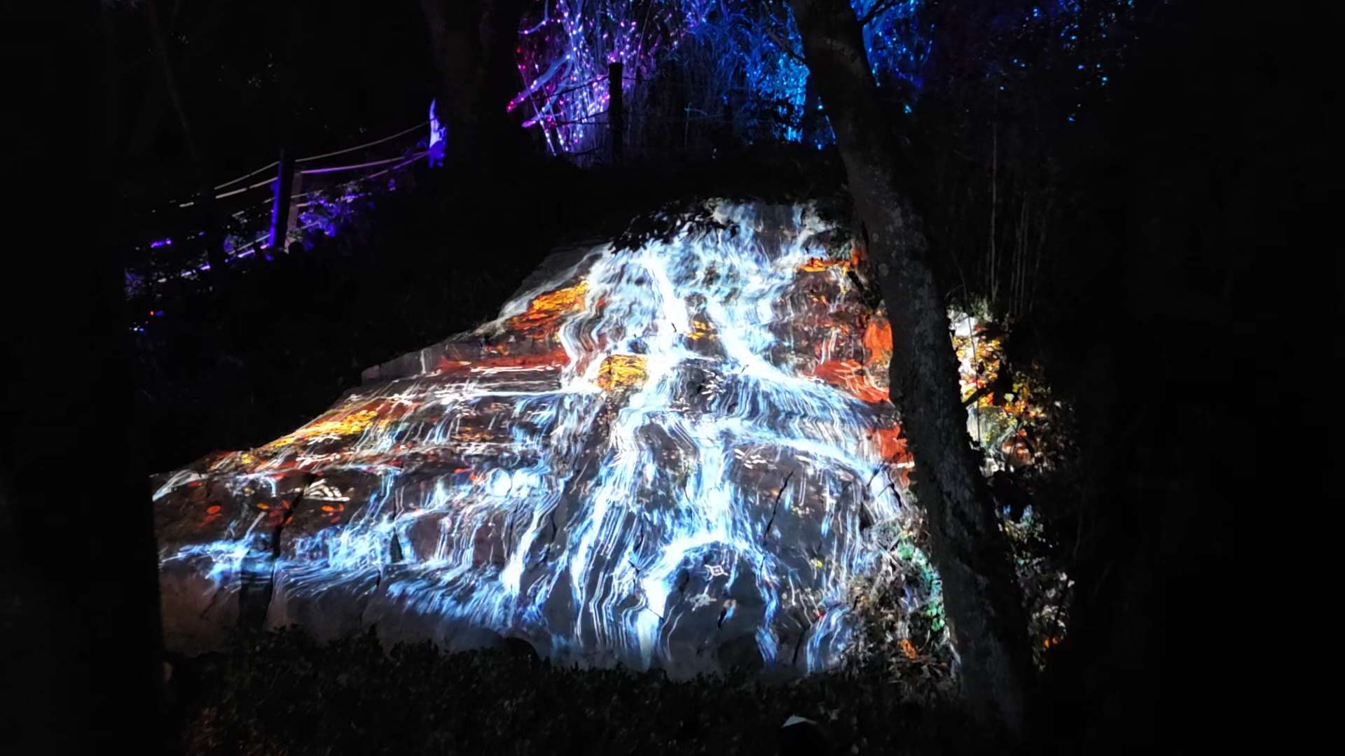 미디어아트: 바위와 나무 위로 흐르는 형광빛 조명(네 번째 사진)은 마치 마법이 걸린 듯한 느낌을 줍니다.